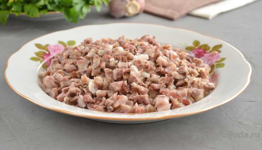 3. С подготовленных кусков срезаем кожу, мясо и жир нарезаем на небольшие кусочки и выкладываем на тарелку или в миску. Мясную заготовку для холодца можно еще пропустить через мясорубку.