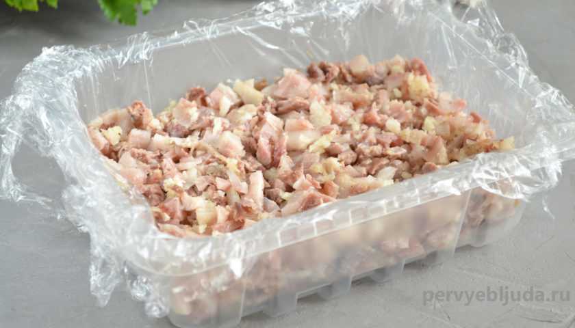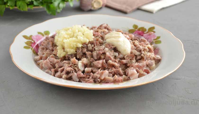 5. Очищенные дольки чеснока выдавливаем через пресс и добавляем на мясо. В случае если мясо для холодца измельчаем через мясорубку, то чеснок тоже пропускаем вместе с мясом. Хорошо перемешиваем и подготовка мяса завершена.