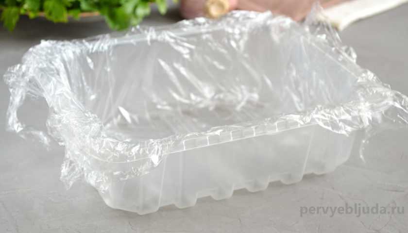 7. Один большой или несколько маленьких пластиковых контейнеров выстилаем полиэтиленовой пленкой. С ней будет очень удобно извлекать холодец из контейнера. Для приготовления закуски можно использовать неглубокие стеклянные или металлические миски.
