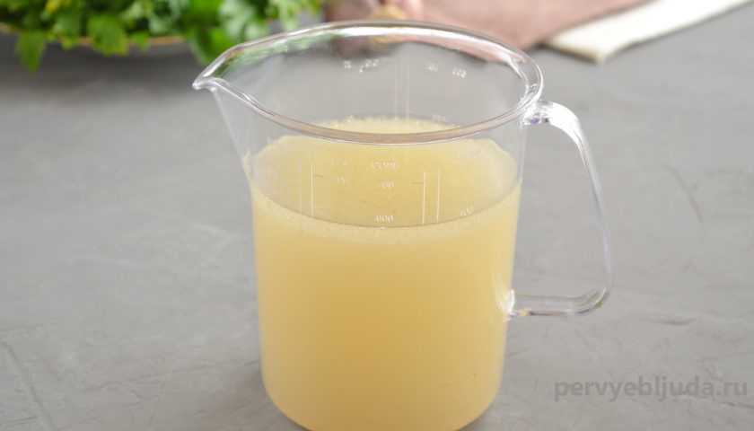 6. Концентрированный бульон переливаем в миску с «носиком», так будет намного удобнее заливать мясо.