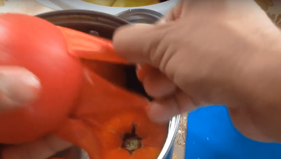 - Чистим, моем луковицу, перец и томаты. Чтобы без проблем снять кожицу с последних, их надо ненадолго положить в кипяток, перед этим нанеся несколько неглубоких надрезов;