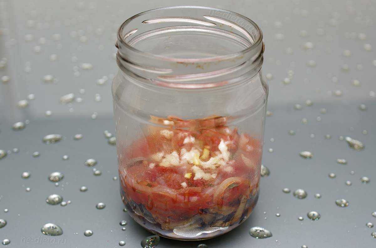 - Теперь уложите овощи в банку слоями: баклажаны-начинка-несколько ломтиков чеснока, и так до тех пор, пока банка не заполнится доверху. Последним слоем обязательно должны быть уложены баклажаны.