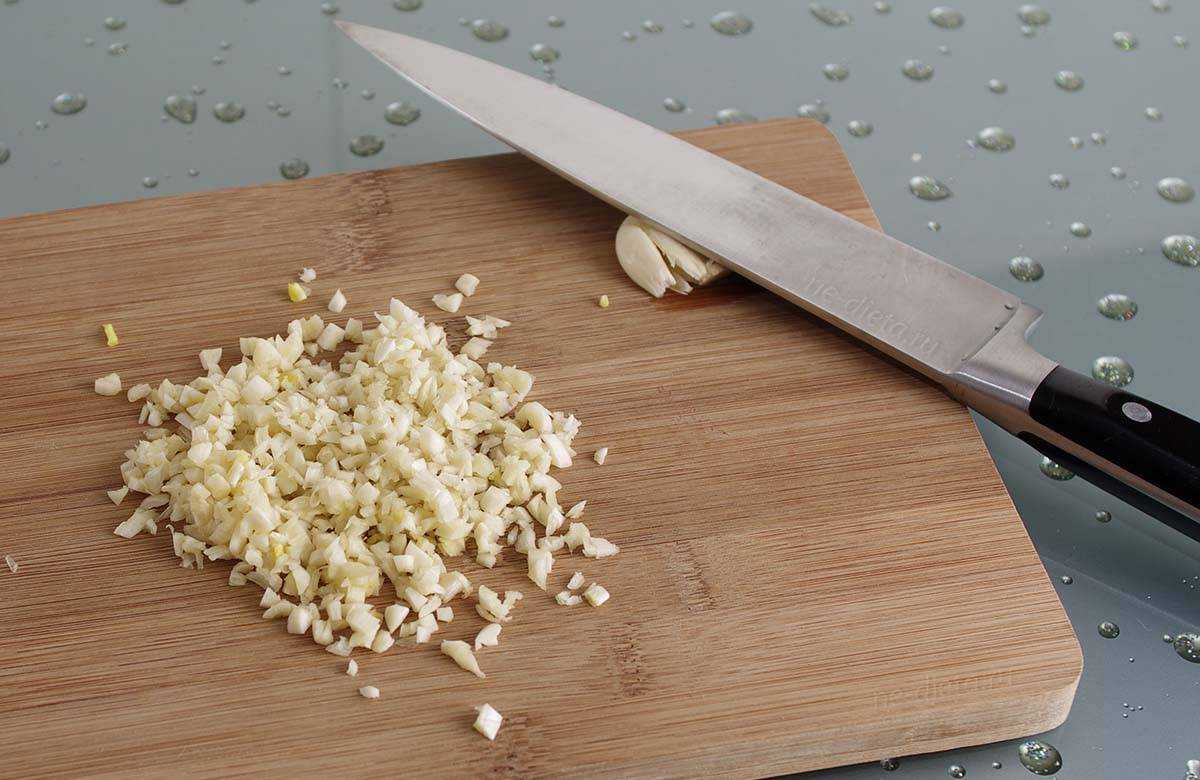 - Обжаривают только мелко нарезанный лук, а чеснок пропускают через пресс.