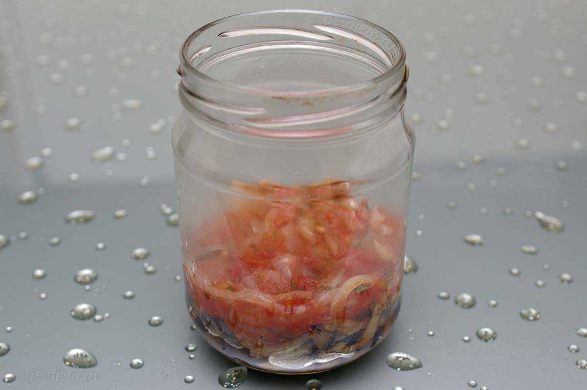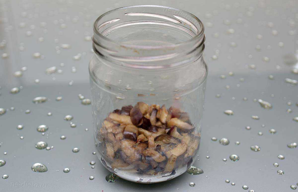 11. На дно стеклянной банки выложить слой жареных баклажанов толщиной в 1.5 — 2 см.