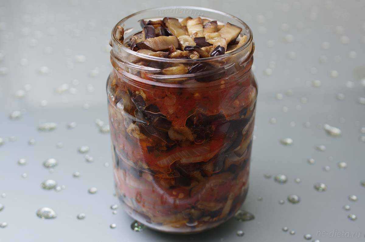 - Для заготовки на зиму следует выложить обжаренные ломтики в стерилизованные банки, затем залить баклажаны приготовленным горячим томатным соусом, закрыть крышками, перевернуть вверх дном и укутать теплым одеялом. Для употребления блюда сразу, необходимо дать время настояться и немного остыть.