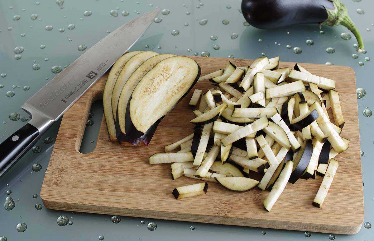 1. Для того чтобы приготовить имам баялды, баклажаны хорошо вымыть, разрезать сначала вдоль на 6 – 8 ломтиков, а затем поперек, чтобы получилась длинная тонкая соломка. Желательно делать одинаковые по размеру ломтики, чтобы они все равномерно прожарились.