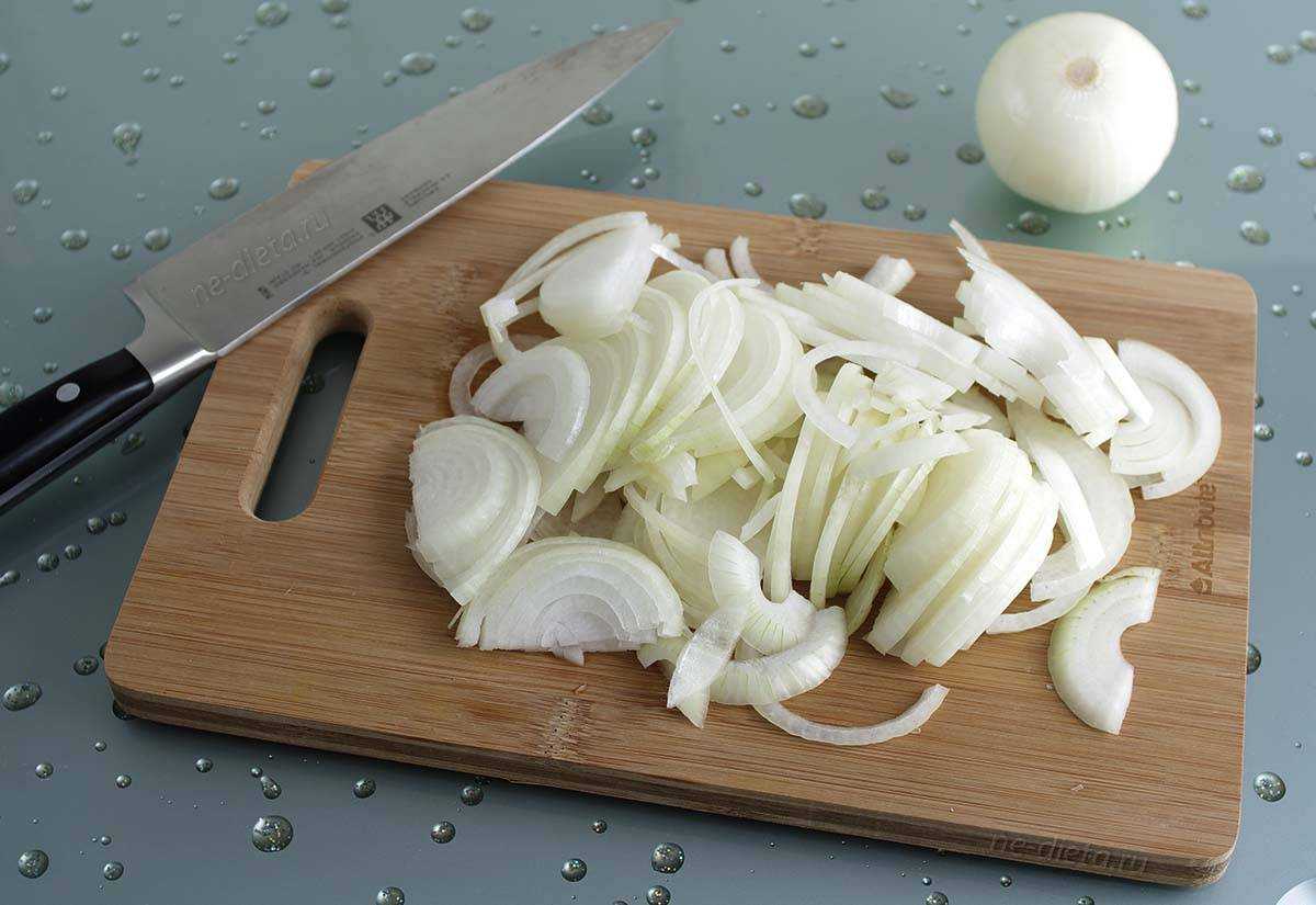 - Затем необходимо обжарить в глубокой сковороде или сотейнике очищенный и нарезанный полукольцами репчатый лук до легкого карамельного оттенка.