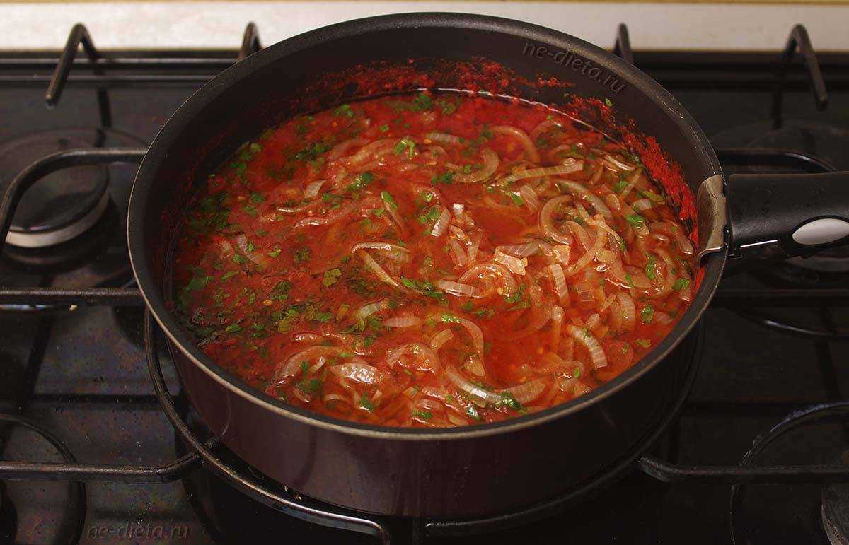 8. В глубоком сотейнике разогреть оставшиеся 200 мл подсолнечного масла, выложить измельченные помидоры и уваривать их на маленьком огне при небольшом кипении в течение 15 – 20 минут.