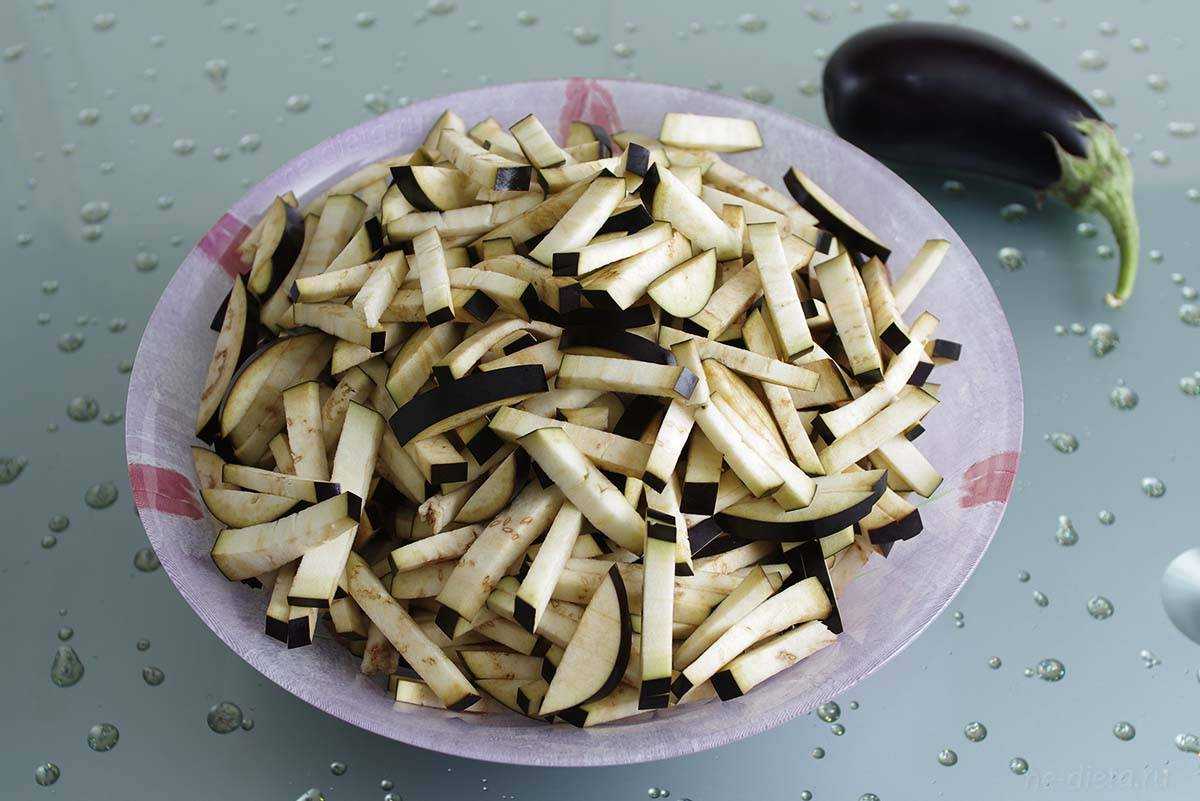 - Предварительно вымытые и очищенные от кожуры баклажаны нарежьте на небольшие ломтики и замочите в слегка подсоленной воде на 40-60 минут (чтобы удалить горьковатый привкус). Затем с помощью дуршлага хорошенько промойте плоды теплой водой.