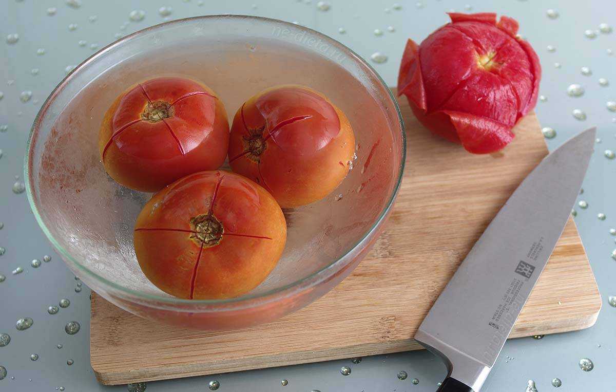 - Совет: чтобы облегчить процесс снятия кожуры, помидор нужно поместить в кипяток на 10 — 15 секунд (или обдать кипятком), и тогда шкурка будет легко отделяться от мякоти помидора.