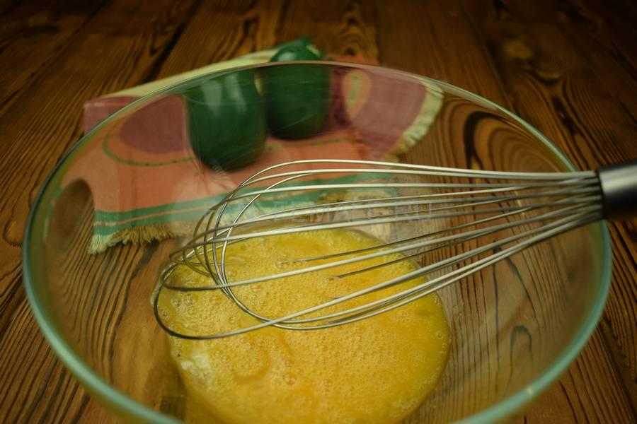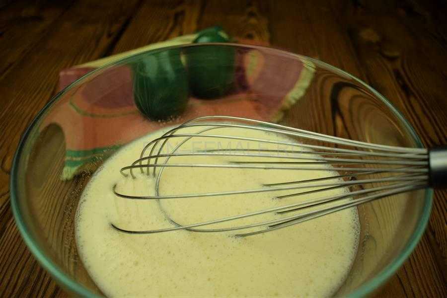 Постепенно всыпая муку, замешиваем тесто средней густоты (примерно, как на оладьи). Работаем венчиком — разбиваем мучные комочки (ни одного не должно быть).