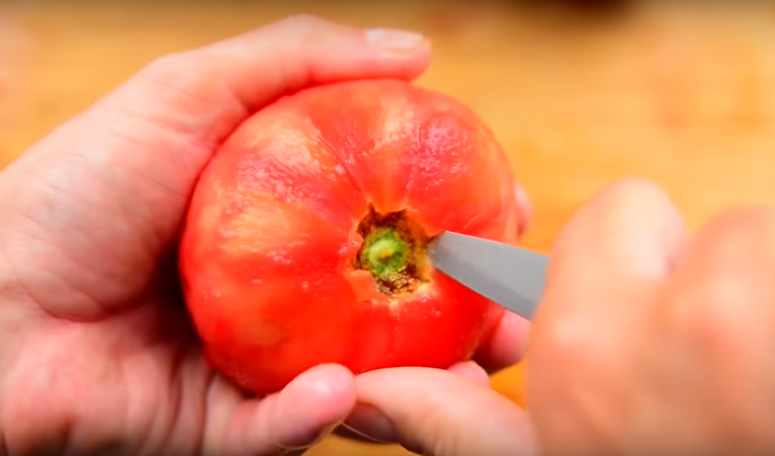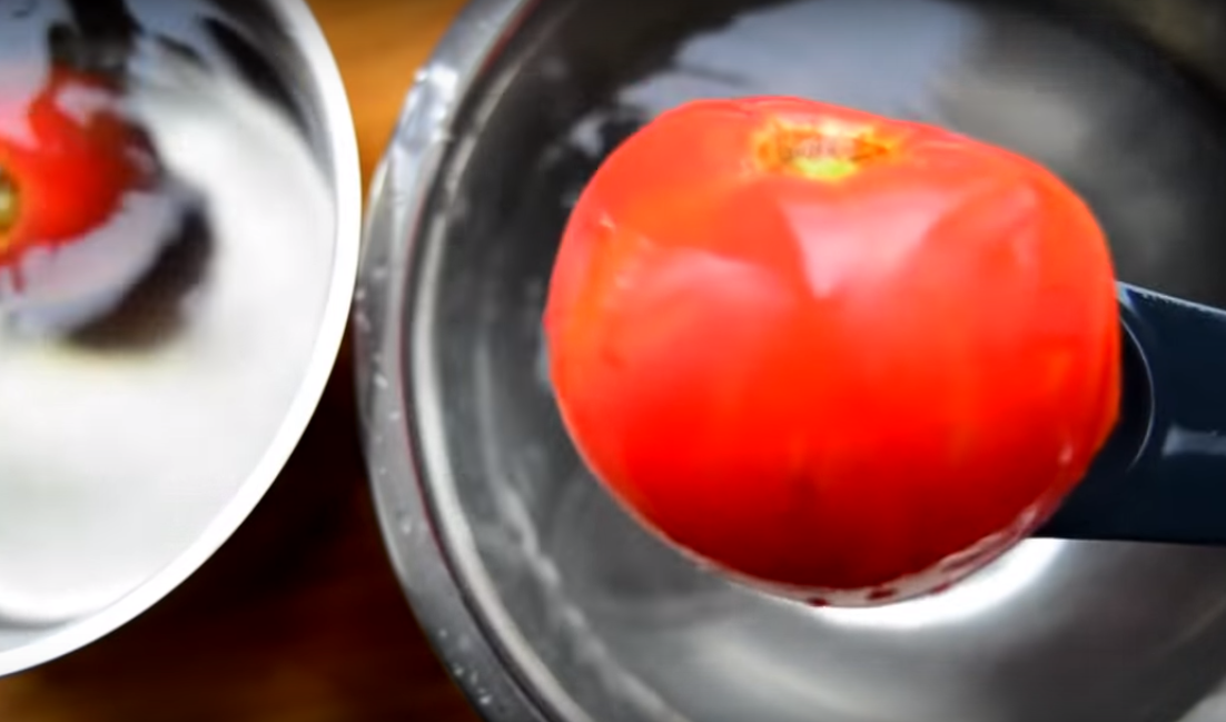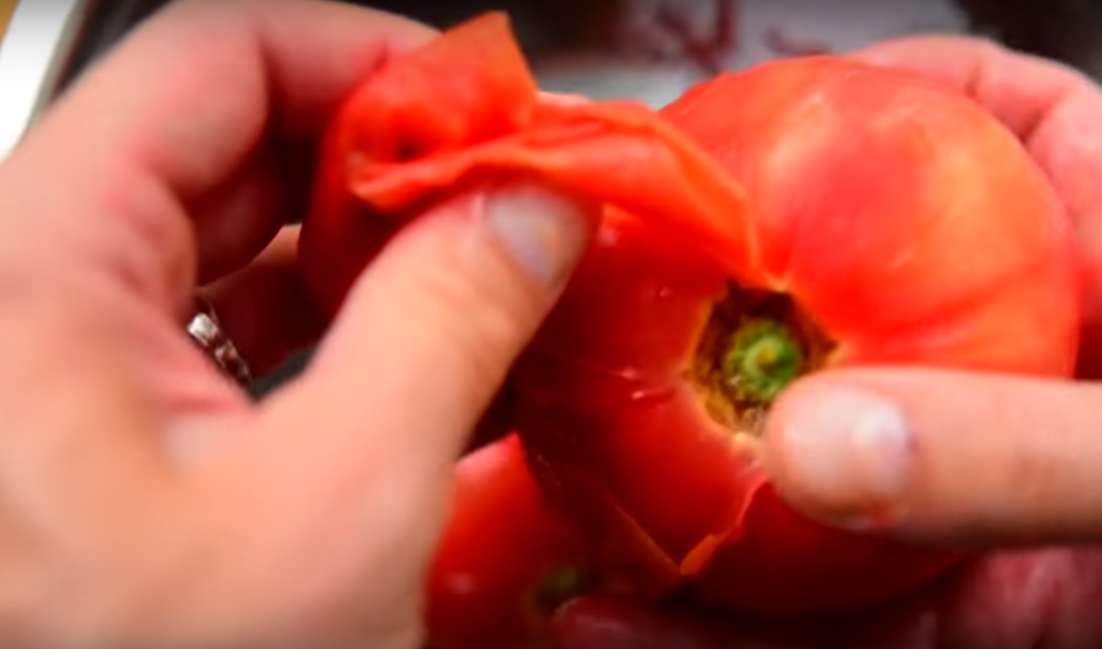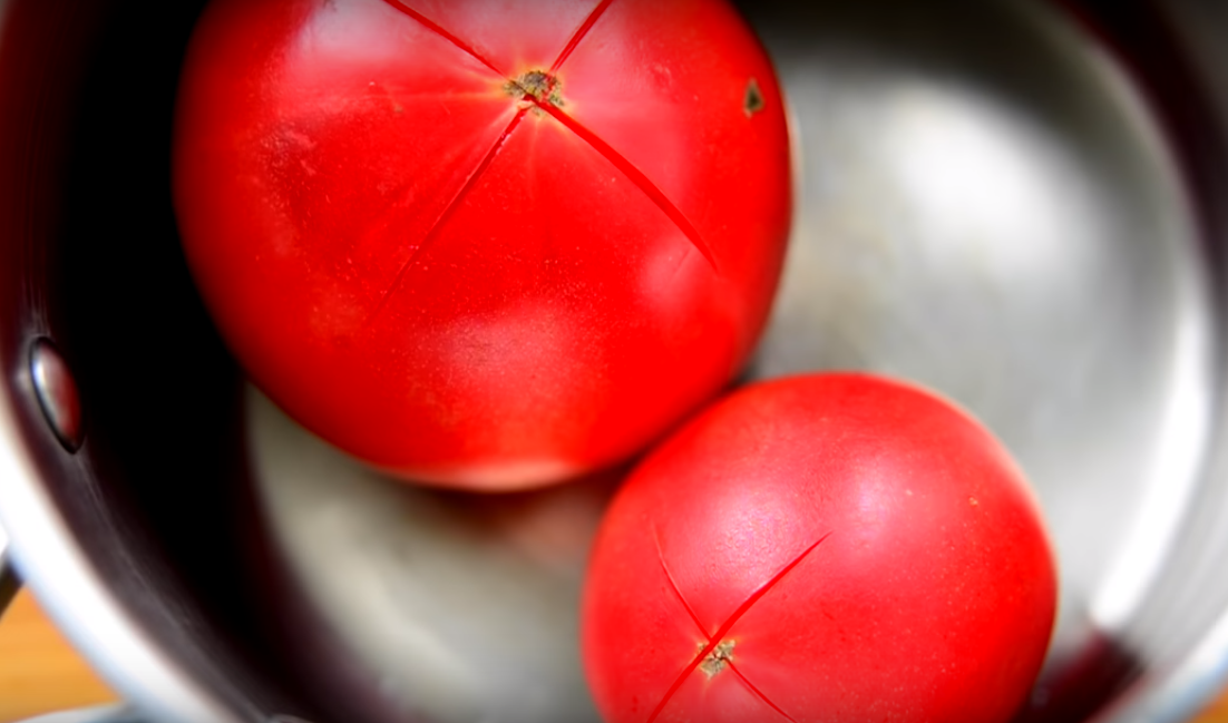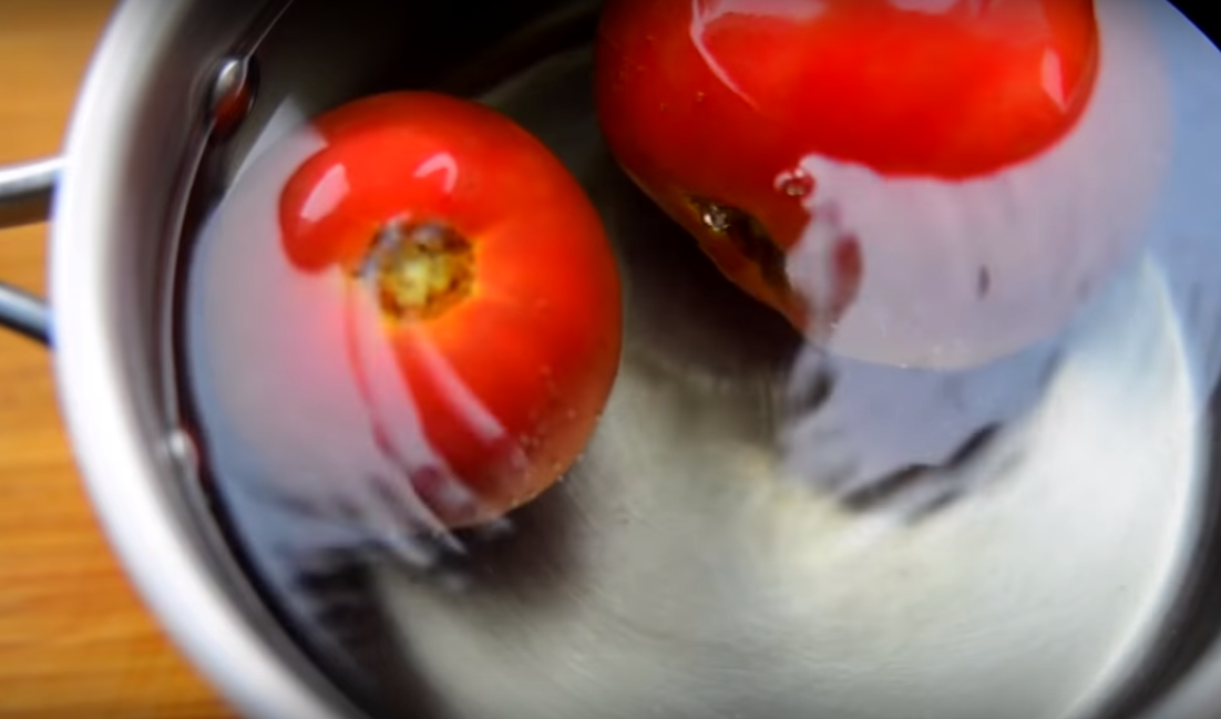 3. Помидоры выбираем спелые, вкусные, сочные. С них необходимо снять кожицу. Для этого делаем крестообразный надрез, заливаем кипятком на одну минуту.