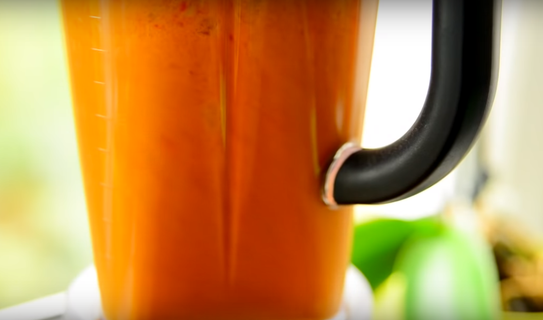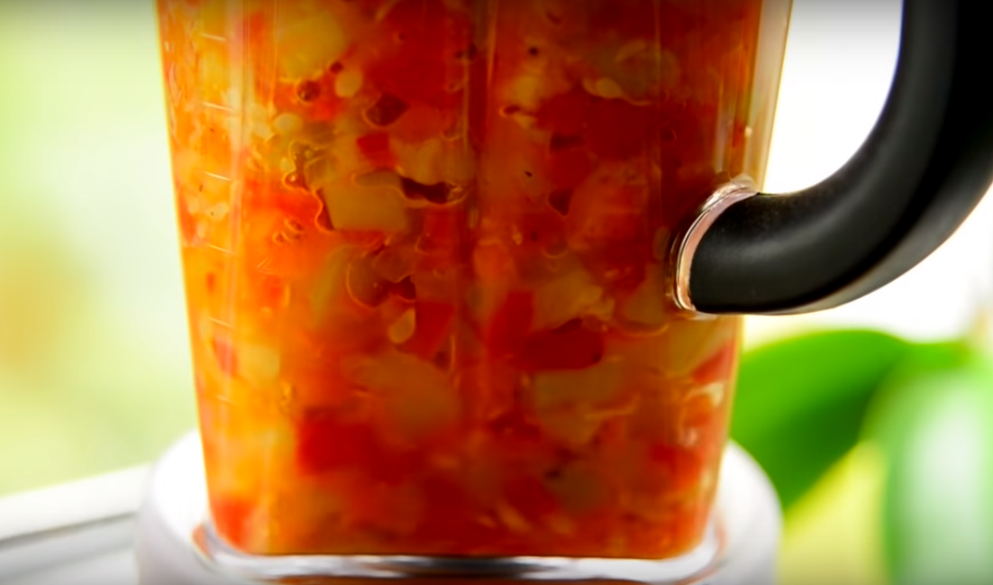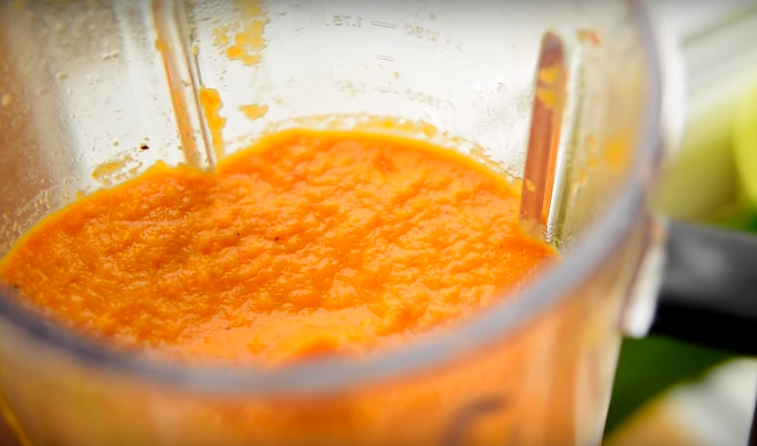 После того, как обжарите все овощи, переложите их в чашу блендера. Туда же слейте масло со сковороды. Пропустите овощи через блендер. Степень измельчения продуктов контролируйте визуально.