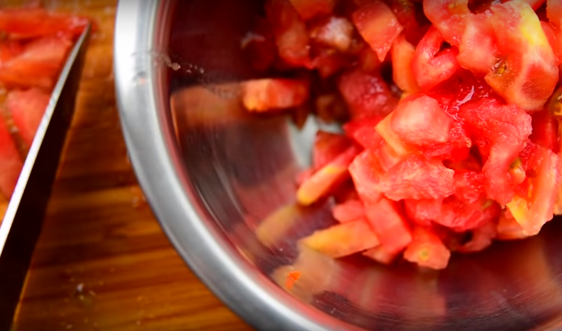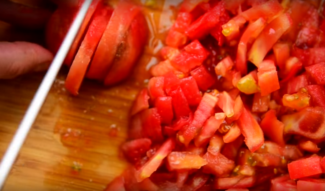 5. Помидоры нарезаем мелкими кубиками. Помещаем в кастрюлю.