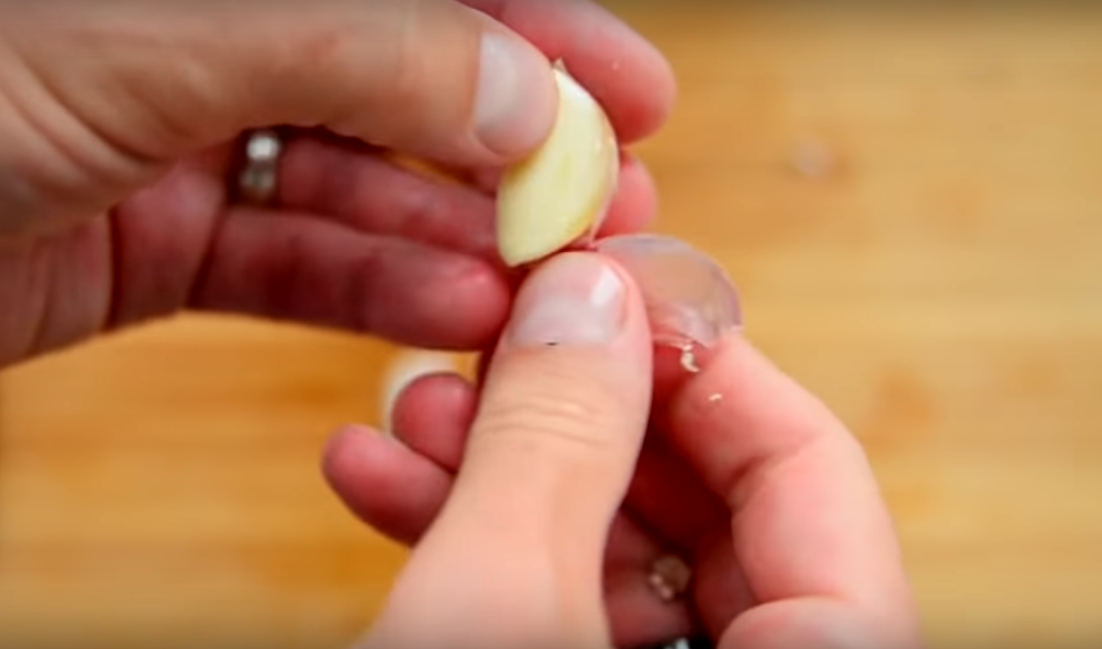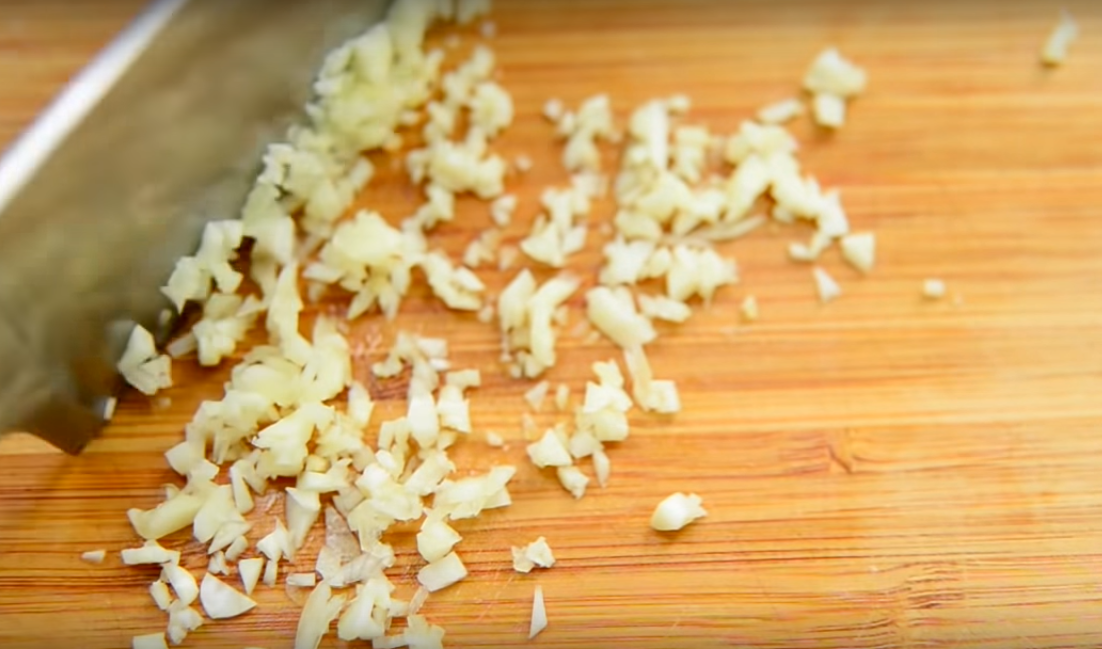 12. Придавим тыльной стороной ножа чесночок. Очистим и измельчим его.