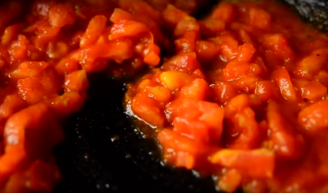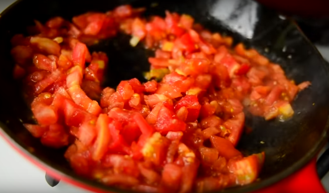 18. Измельченные томаты также тушим на сковороде в течение нескольких минут, до полуготовности.
