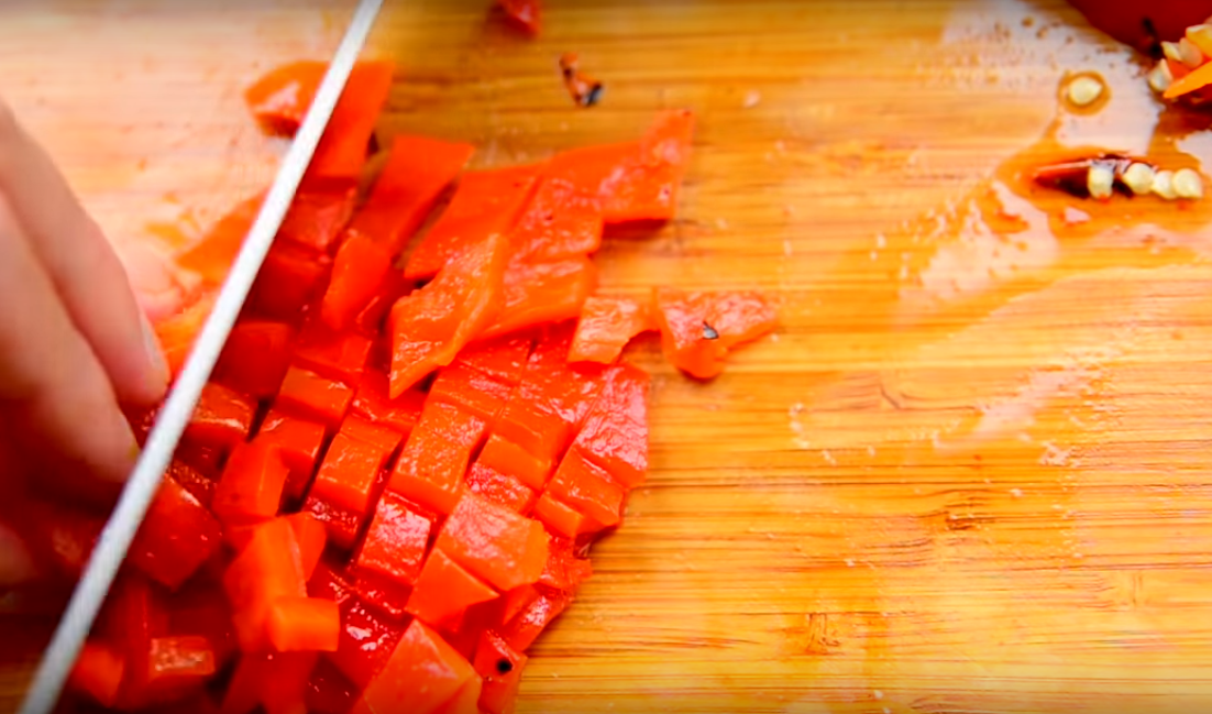 9. Нарезаем мелкими кубиками болгарский перец. Он придает неповторимый вкус и аромат нашей кабачковой икре.