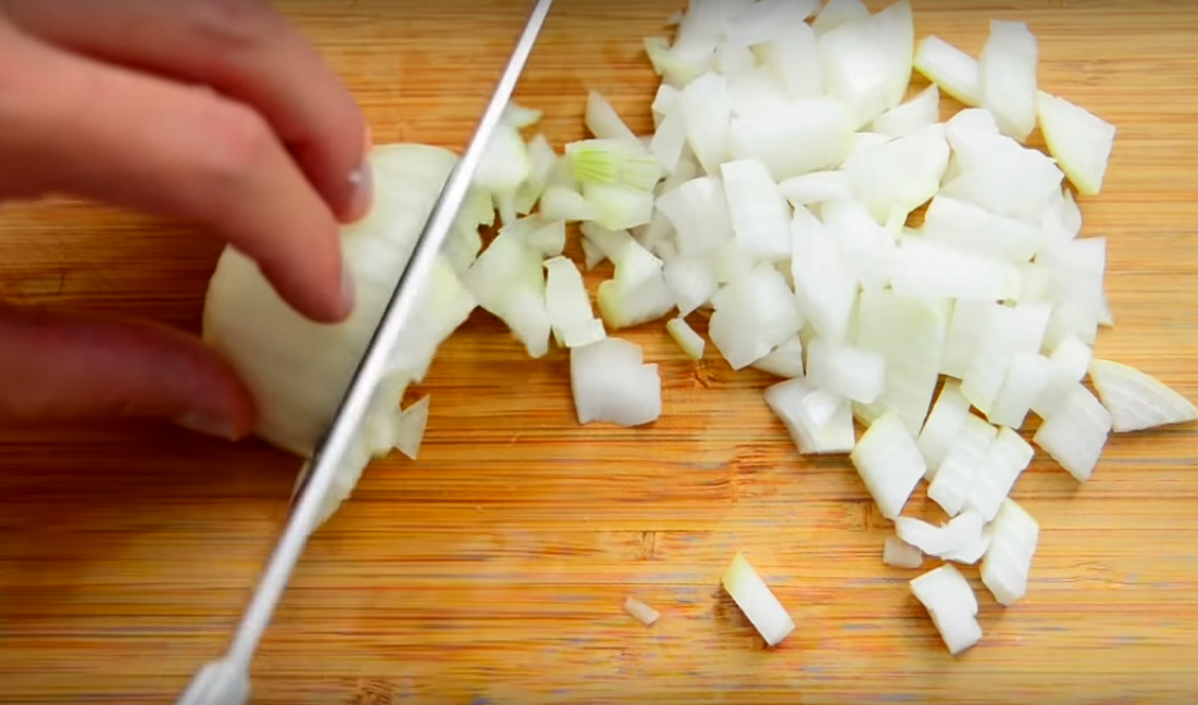 11. Мелко нарезаем очищенный лучок.