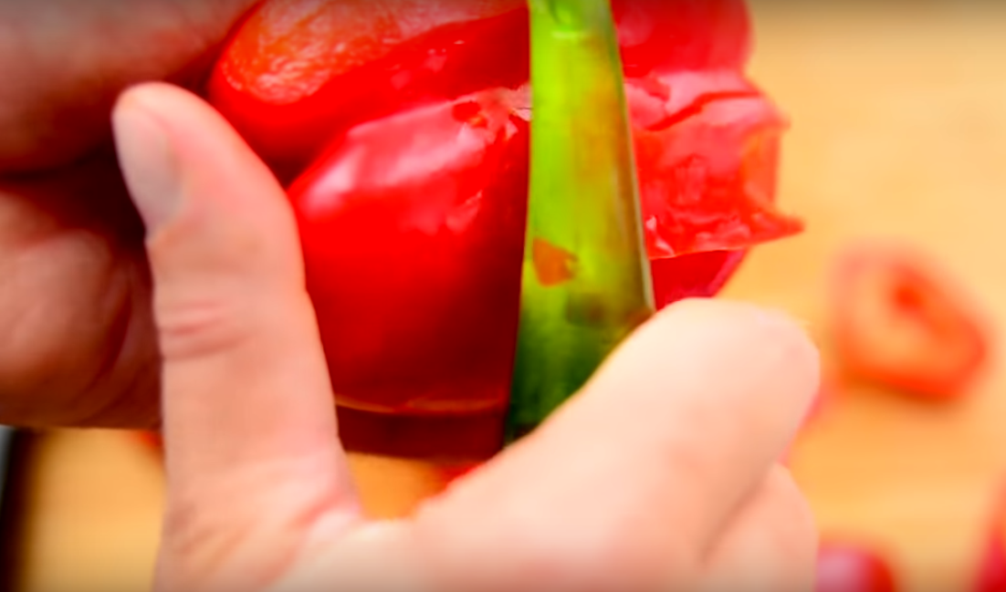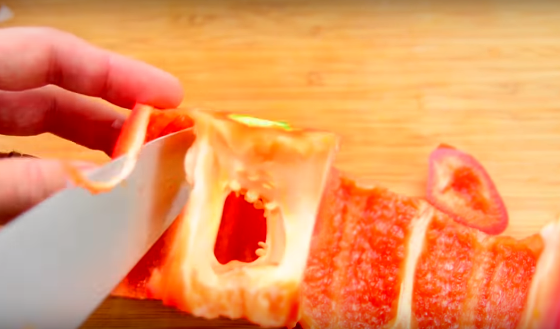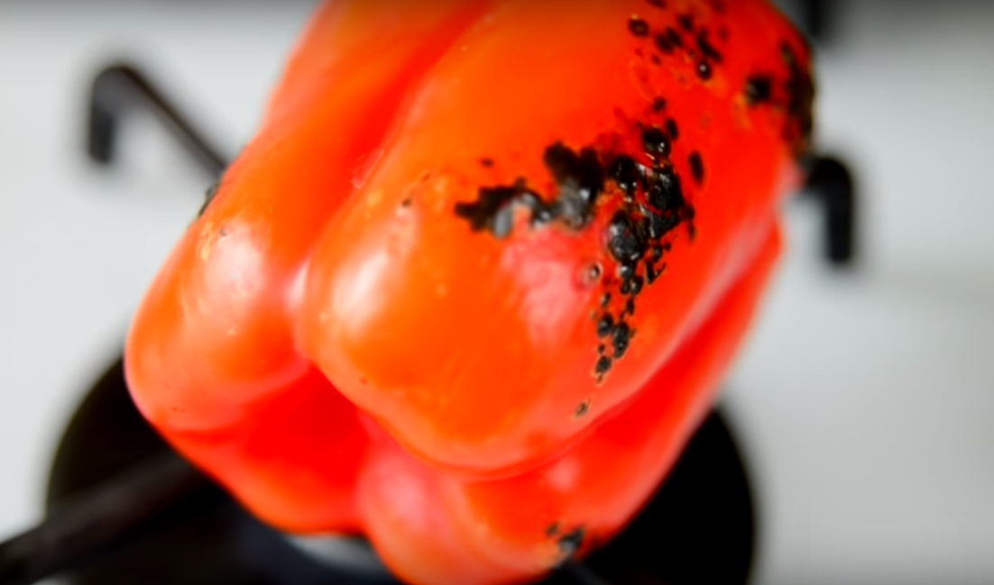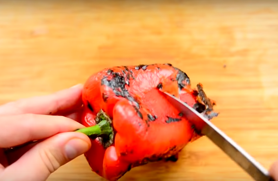 6. С болгарского перца также желательно удалить кожицу. Для этого перец можно запечь в духовке, можно обжечь на открытом огне – и легко ее соскоблить.