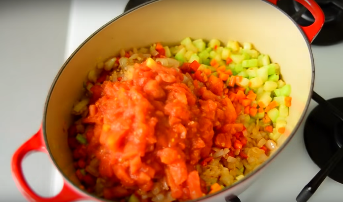 - Добавьте в проваренные овощи помидоры, перемешайте и продолжайте варить на средне-сильном огне, чтобы испарилась лишняя жидкость (минут 20, время будет зависеть от сочности овощей).