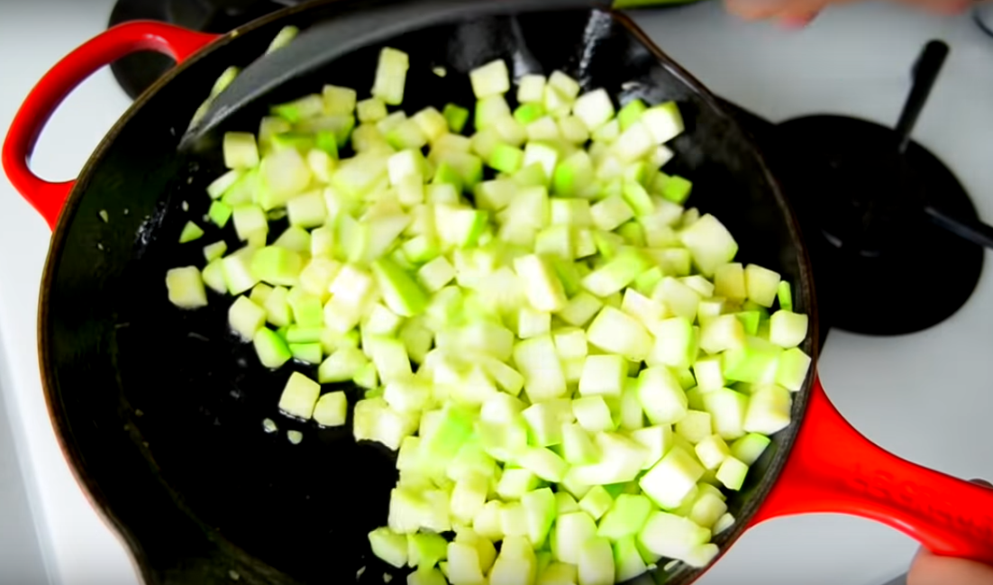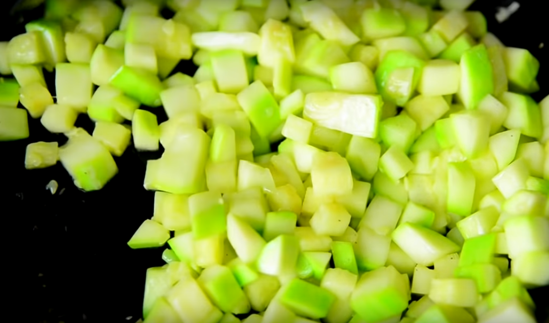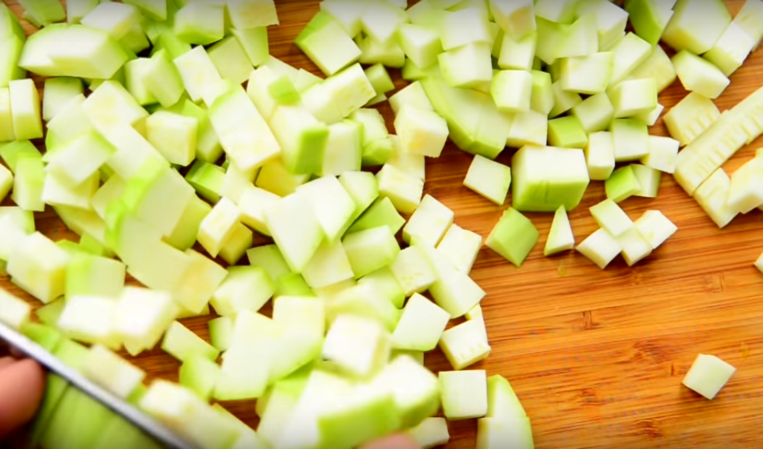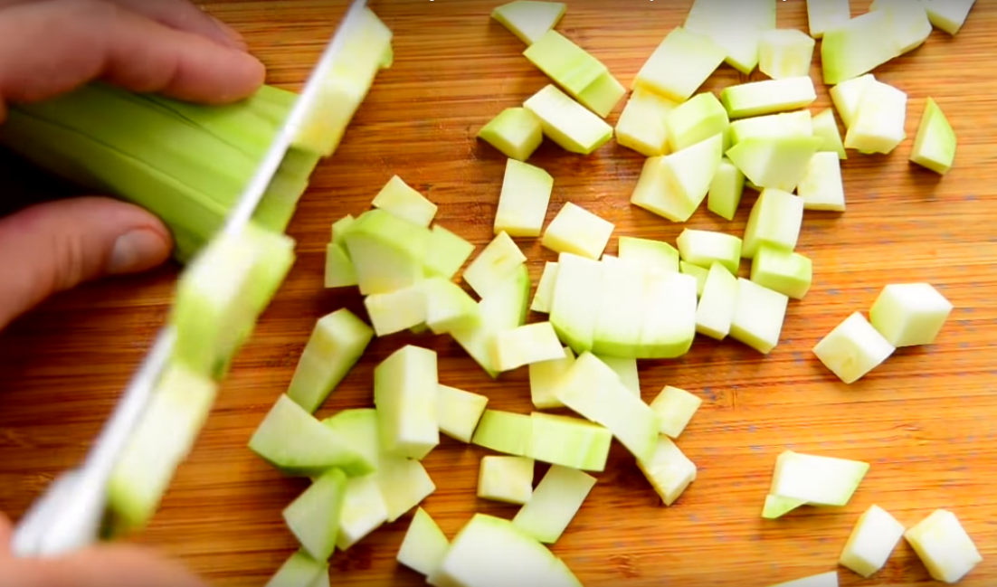 1.Первым делом работаем с кабачком. Очищаем его от грубой кожицы и извлекаем из него все семена. Затем нарезаем на небольшие квадратики.