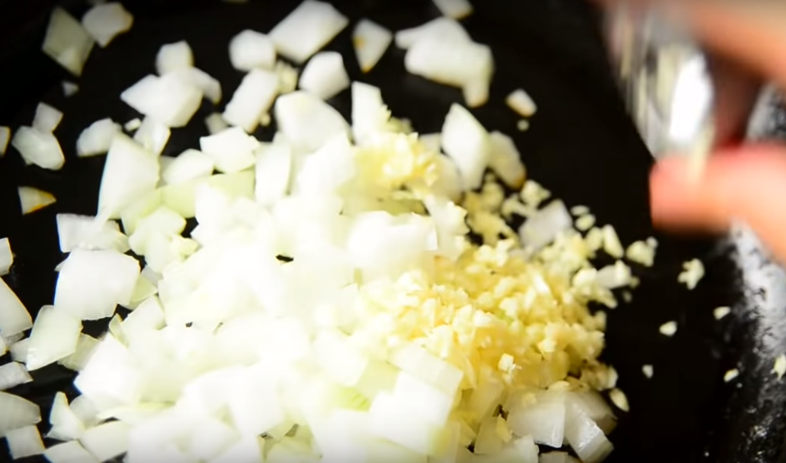 17. Измельченные лук с чесночком обжариваем на растительном масле. Если говорить о пассерованном луке и чесноке, то из них исчезает излишняя острота и горечь, овощи становится мягким и тонким на вкус, приобретая особый, изысканный аромат.