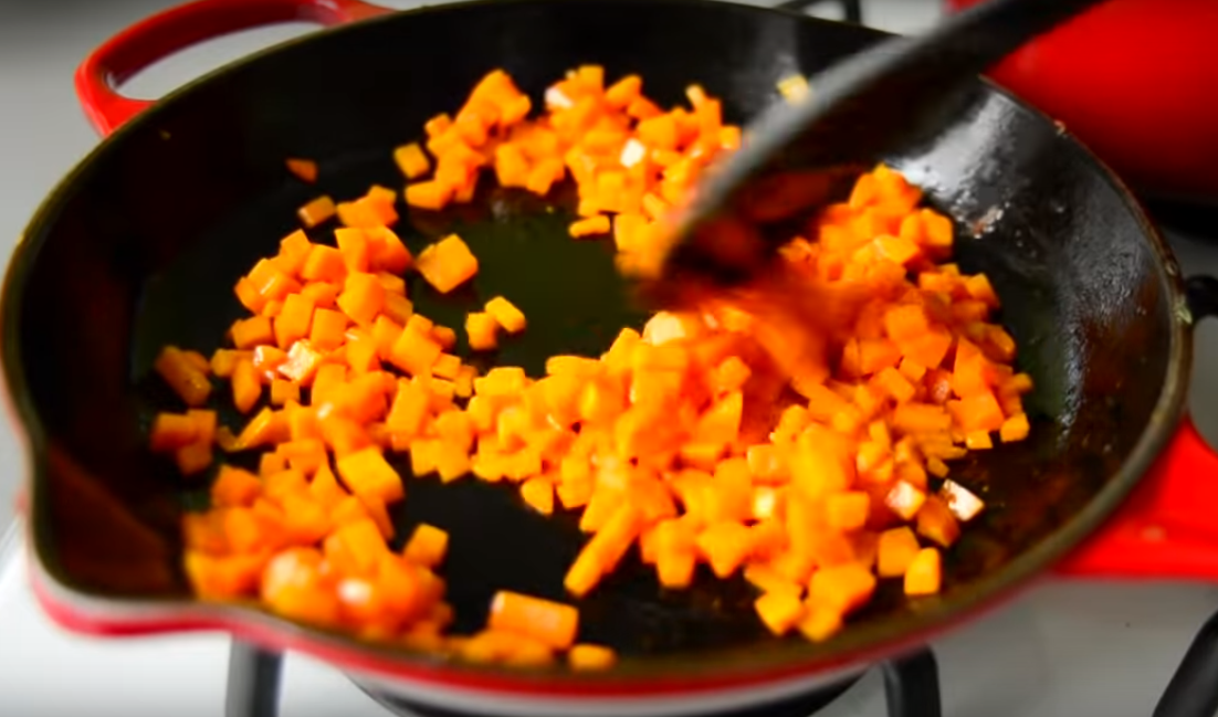 На эту же сковороду добавьте оставшееся растительное масло и обжарьте лук и морковь на небольшом огне до размягчения. Морковь должна приобрети свето-жёлтый оттенок.