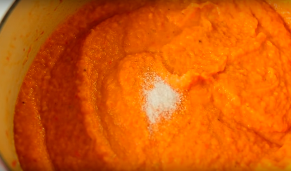 - Далее добавляем к кабачковому пюре 6 столовых ложек томатной пасты, 1 столовую ложку соли, 4 столовых ложки сахара, а также немного черного и красного молотого перца по вкусу.