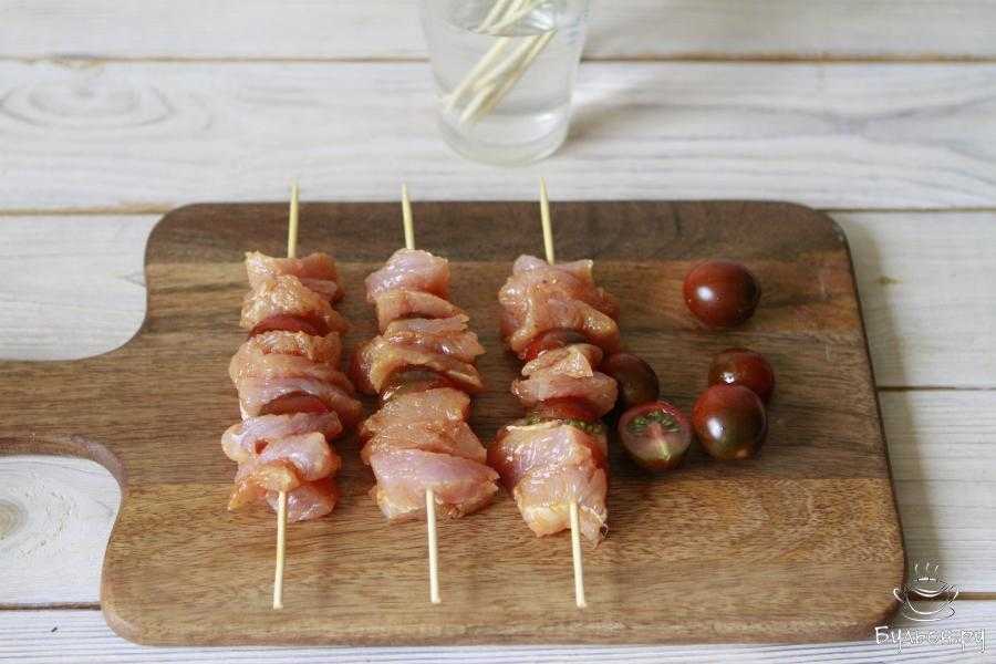Духовку предварительно прогреваем до 230 градусов. На шампура нанизываем мясо, чередуя его с нарезанными кружочками помидорами.