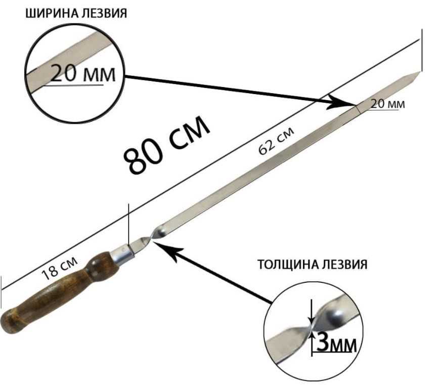 Длина шампура напрямую зависит от размеров мангала, на котором готовится мясо. Лезвие шампура должно находиться над мангалом, а вот сторона ручки должна находиться на 20-25 сантиметров от жарящего мангала.