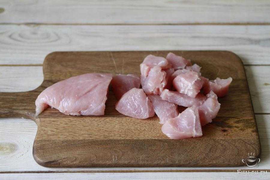 2. Нарезать мясо на кусочки. Примерно 4 на 4 сантиметра. Лучок почистить и нарезать не очень тонкими колечками.
