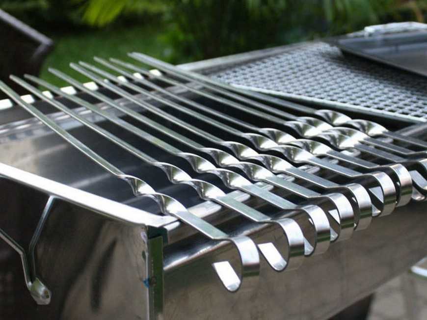 - металлические. Приобретается исключительно для длительной эксплуатации в несколько лет. Подразделяются на алюминиевые и стальные. Первый вариант не актуален, так как алюминиевые изделия сильно гнутся. Поэтому стоит выбирать шампуры из нержавейки, они не гнутся и не испортят вкус мяса.