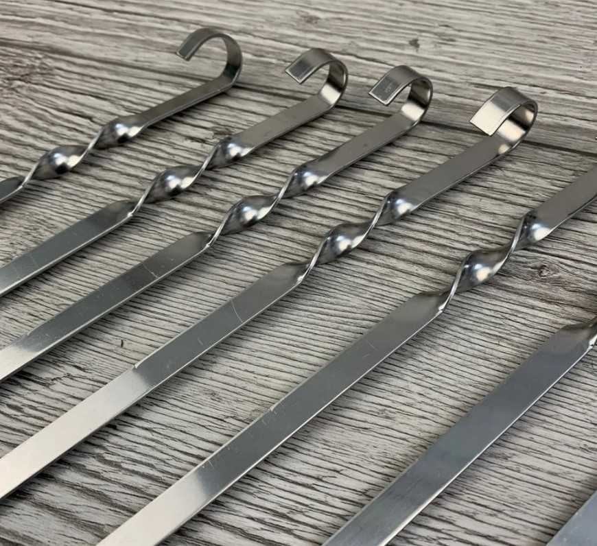 Не менее популярный вариант шампуров, которые идеально подходят для приготовления толстых кусков мяса. На конце они имеют небольшой сред под 60 или 90 градусов.