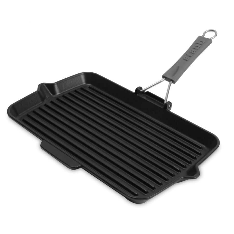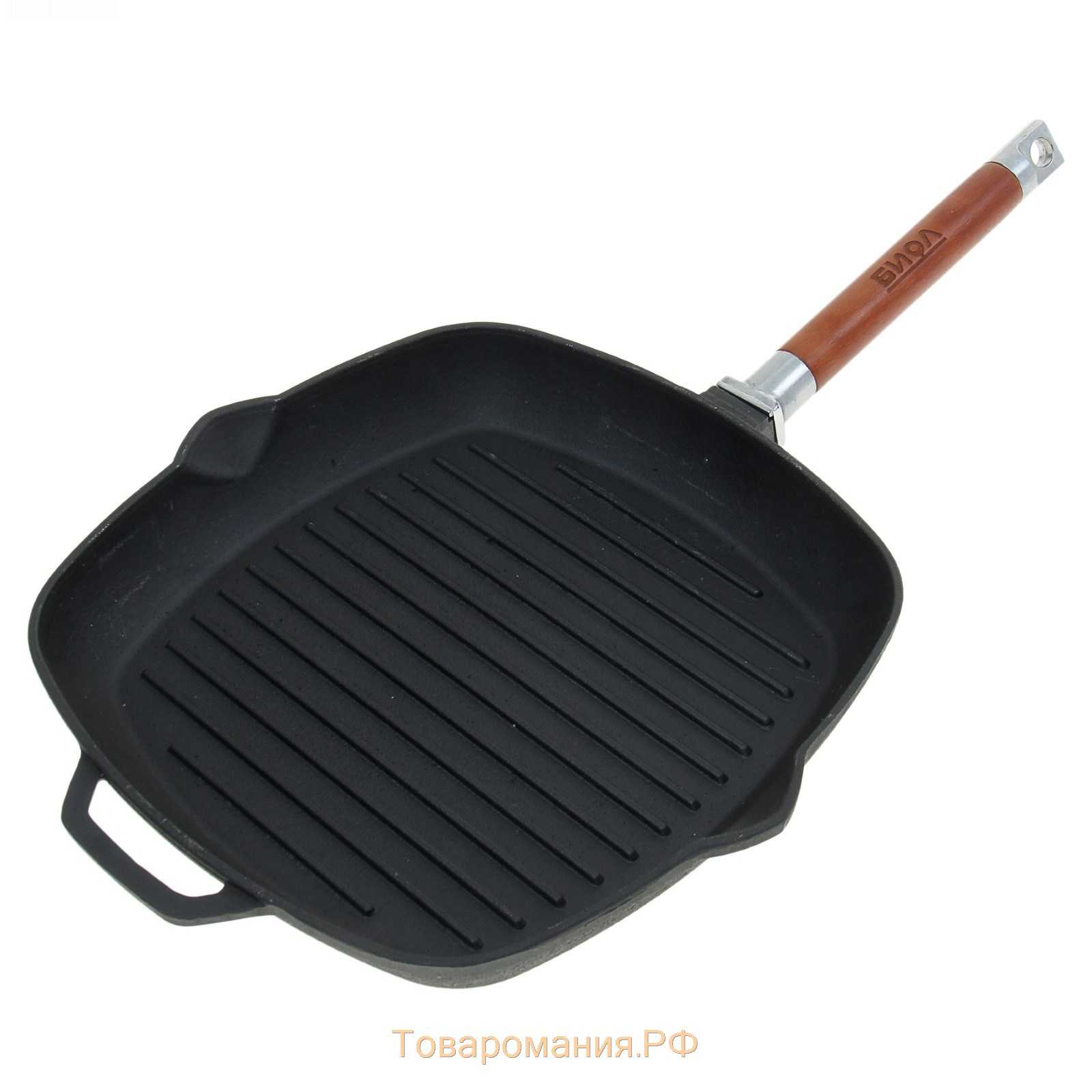 - хорошо, когда ручка цельнолитая и покрыта жаропрочным материалом. Не менее удобными являются складывающиеся ручки, которые позволяют использовать сковороду-гриль в духовом шкафу.