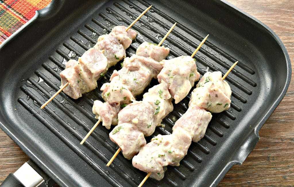 - Через три часа, вкусно пахнущим мясом нанизать шампура, и обжаривать блюдо на разогретой сковороде – гриль до золотистого цвета.