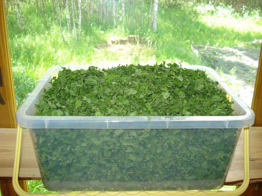 Нарезанная зелень высохнет на подоконнике за несколько дней. Ее надо положить на пергамент или холщовую ткань. Два раза в день трава переворачивается аккуратными движениями, чтобы сохранить листочки. Толщина слоя — максимум полтора сантиметра: влага, содержащаяся в зелени, должна испаряться.