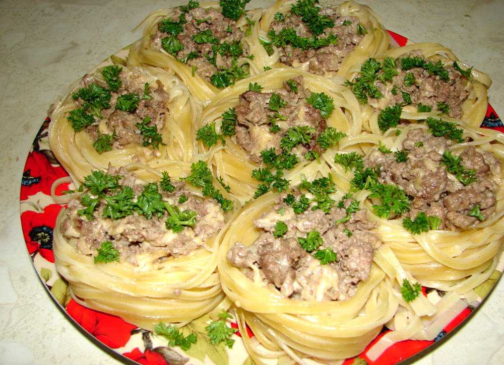 Сочные гнезда из макарон с фаршем в сливочном соусе