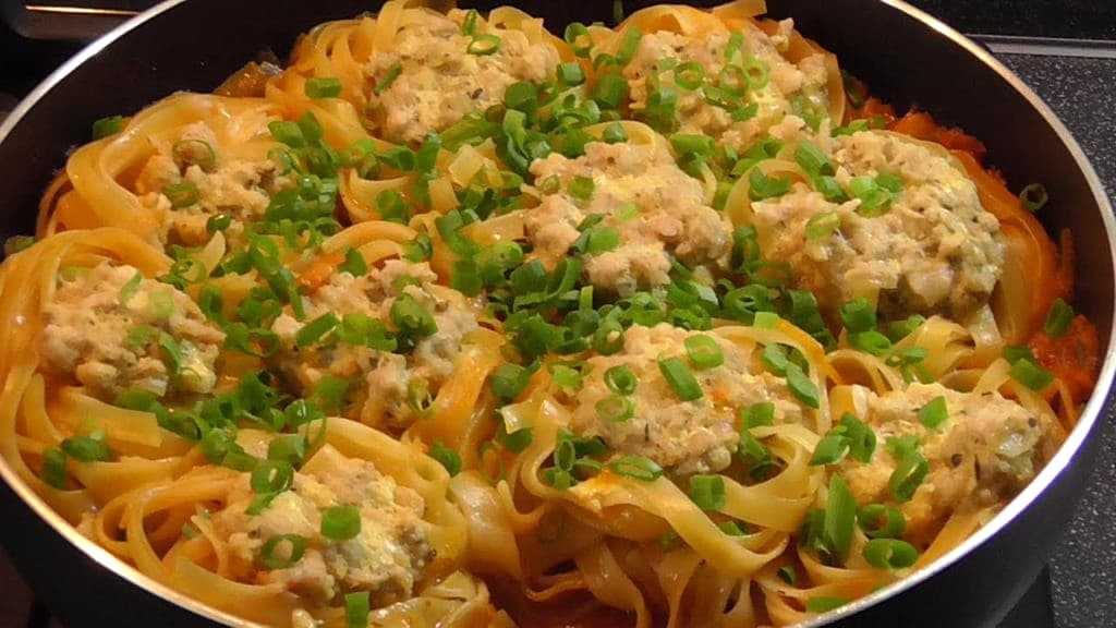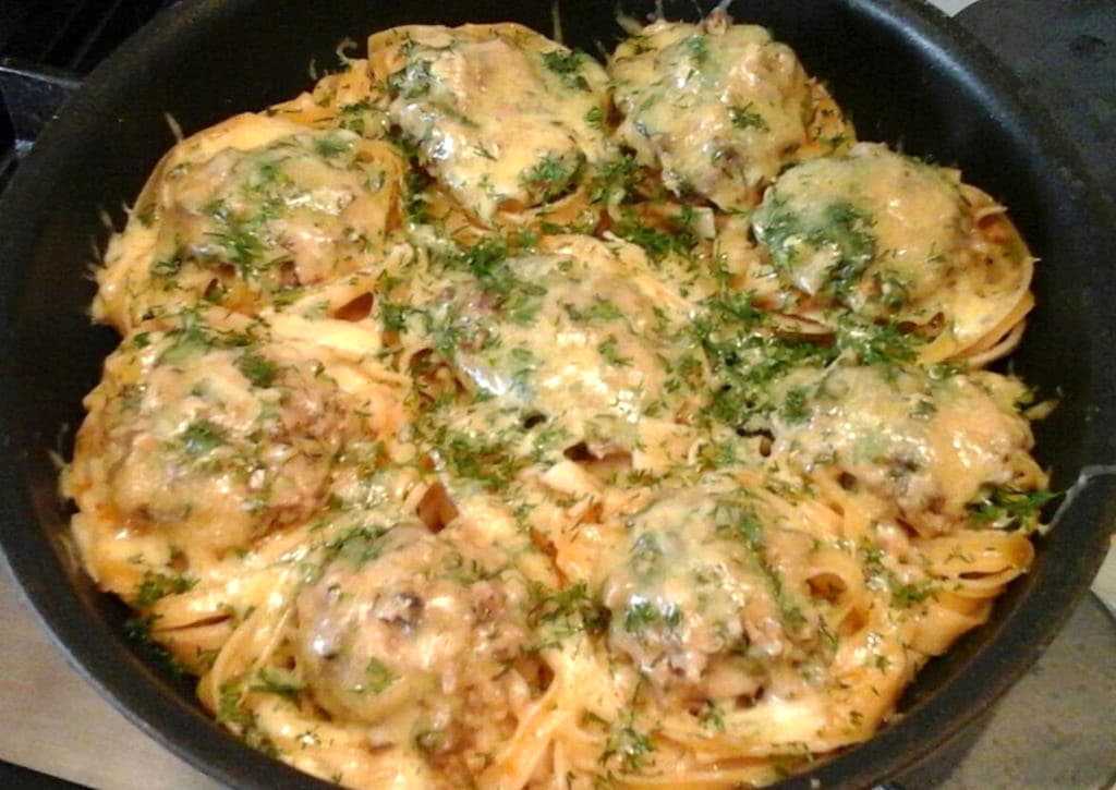 4. Приготовленный фарш делим на 10 равных частей и выкладываем мясные шарики на макаронные гнезда, которые сразу же погружаем в сковородку с горячим сливочным соусом.