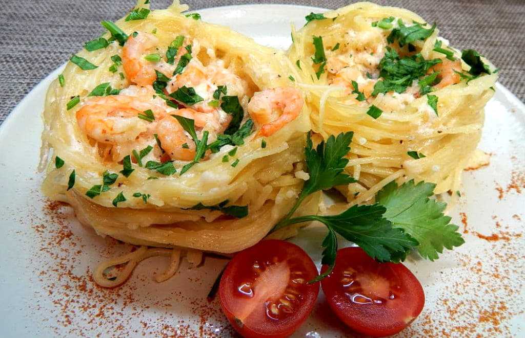- Предварительно отваренные гнезда (время готовки — 3-4 минуты в кипятке) нафаршировать креветками и соусом. Подавать в горячем виде.
