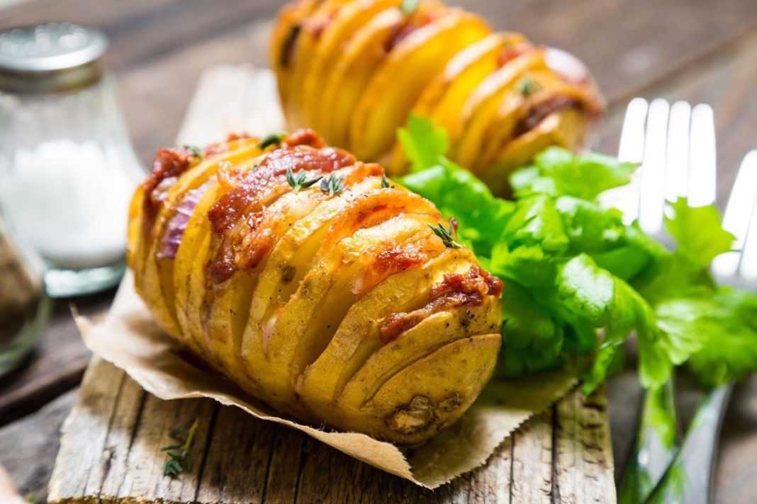 Подготовленный картофель нарезают поперек, но не до конца. Нижняя часть должна оставаться цельной, чтобы картофель не распадался на кусочки.