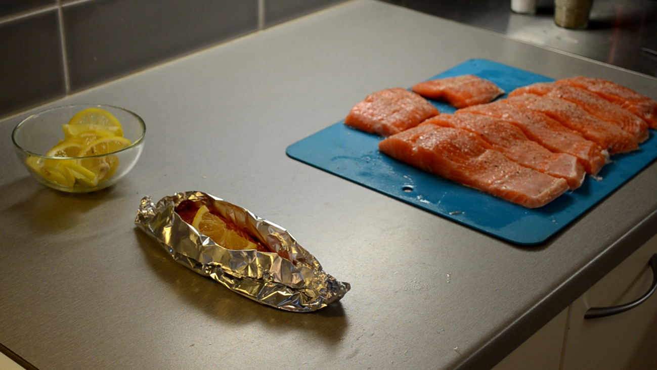 Так как семга сама по себе довольно жирная, то масло нам не понадобится, рыба будет запекаться в собственном соку. Фольгу разрезаем на небольшие прямоугольники, из которых формируем лодочки. В них будет готовиться семга. Для того, чтобы она не высохла, кладем сверху дольку лимона. Основное блюдо готово к грилю.