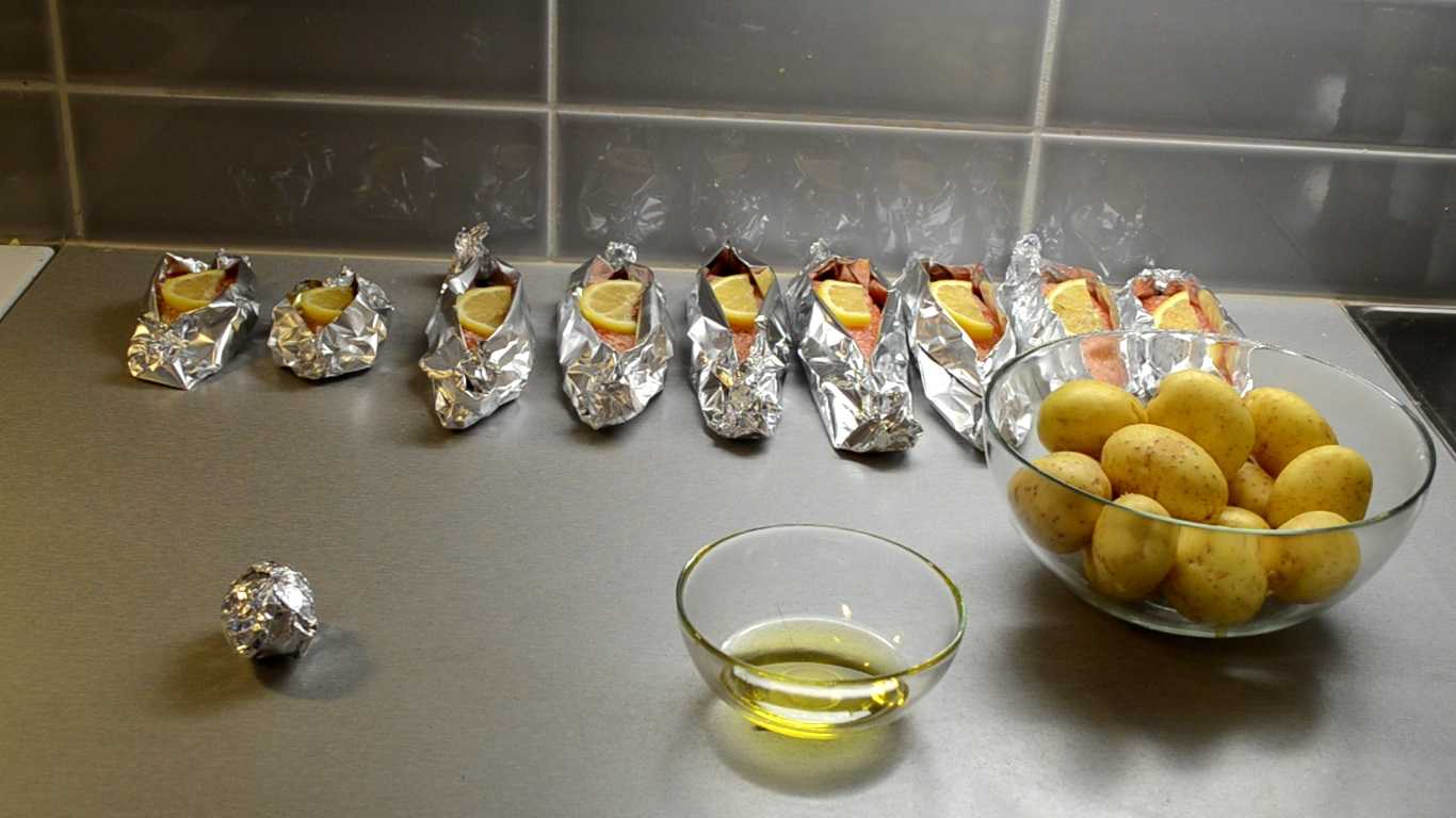 В качестве гарнира мы запечем картофель на углях. Для этого нам понадобится молодой картофель, растительное масло, фольга. Смачиваем каждую картофелину в масле и плотно заворачиваем в двойной слой фольги. Итак, все готово, приступаем к грилю.