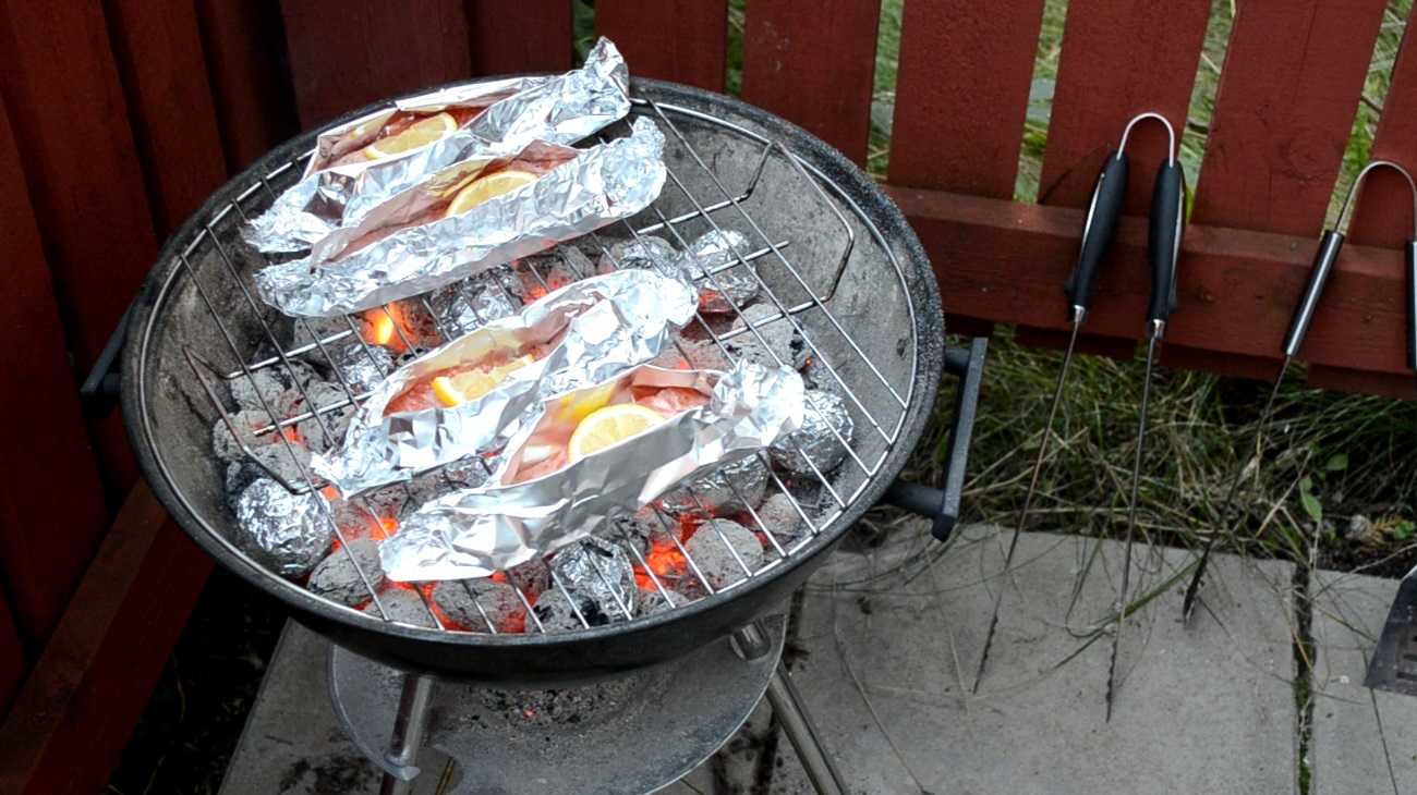 Я рекомендую использовать округлые угли для медленной прожарки на гриле, так как они дают более равномерный и умеренный жар. Особенно это актуально для запекания картофеля. Кладем картофель в фольге в разогретые угли. Потом ставим решетку и кладем на нее лодочки с лососем, ждем 15-20 минут, следим за состоянием рыбы. Картошку необходимо периодически перемещать в углях, чтобы она не подгорела.