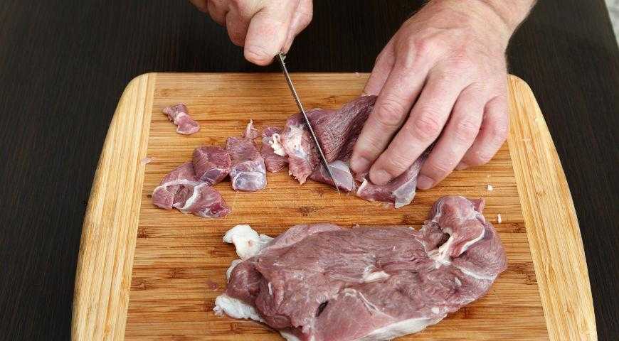 Баранину ополаскиваем прохладной водой. Обтерев бумажными полотенцами, срезаем с куска все лишние плёнки и сало, распускаем его пластинами, сантиметровой ширины. Порезав полосками, рубим мясо топориками, очень мелко. В идеале, мясная масса должна напоминать фарш, перемолотый обычной мясорубкой.