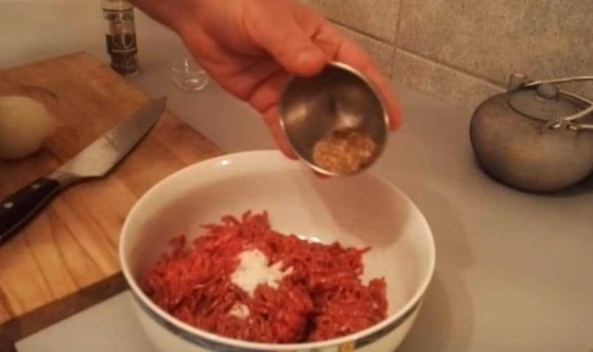 - Процесс завешивания хорошего фарша для люля-кебаба должен выглядеть так: вы тщательно вымешиваете мясо с остальными ингредиентами, а затем с силой отбиваете его о твёрдую поверхность. Затем шаги повторяются. Так нужно делать не менее десяти минут, чтобы говяжий фарш сбился с жиром и в будущем хорошо держался на шампурах.