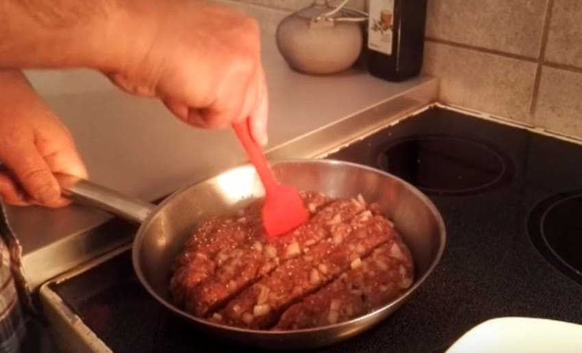 3. Формировать котлеты в этом варианте не нужно. Возьмите сухую сковороду, выложите на нее подготовленную массу равномерным слоем и разровняйте.