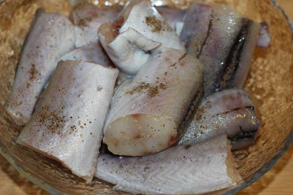 - Минтай чистим, обрезаем плавники, моем и разрезаем пополам на два куска. Натираем солью и перцем черным молотым.