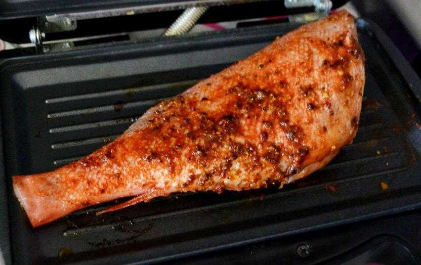 - Смазать любым растительным маслом решетку, выложить на него рыбу, обжаривать с двух сторон по 7-8 минут.