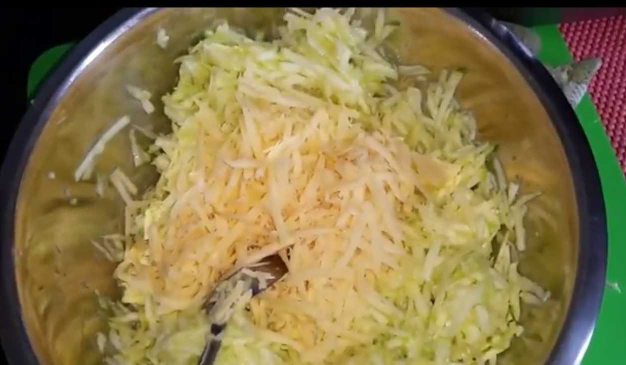 - Чтобы кабачковая стружка выпустили часть сока, посолите ее и оставьте на 10 минут. Перед смешиванием тертой массы с другими продуктами, сок слегка отожмите, выложив на сито. Тогда тесто не расплывётся, а у готового блюда будет аппетитная и хрустящая корочка.