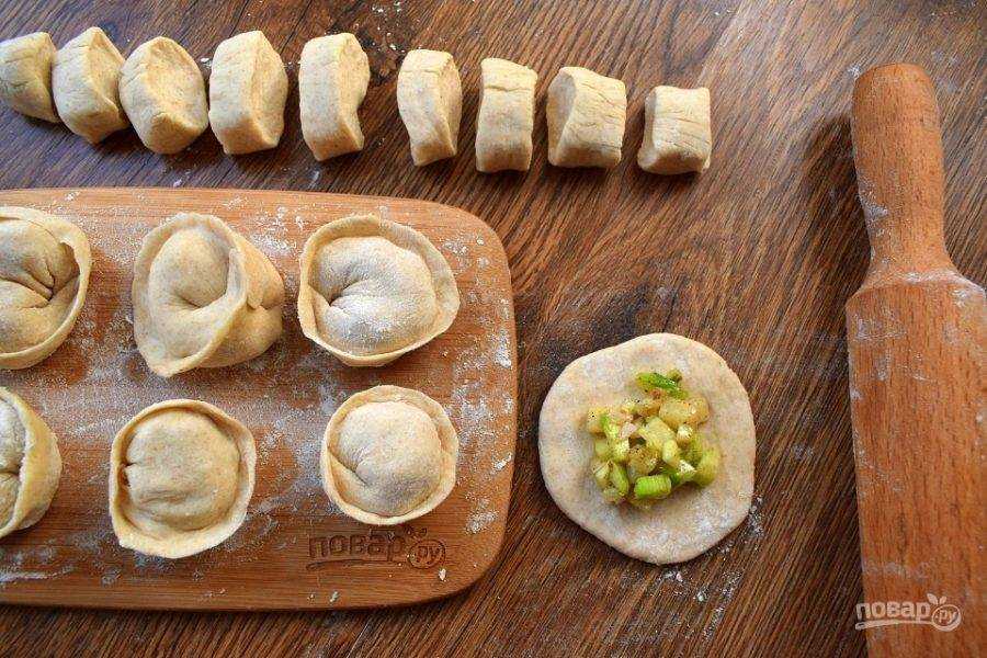 4. Начинайте формировать пельмени, положив небольшое количество начинки в центр каждого круга теста. Сложите половину круга, соединяя края и придавая пельменю полумесяцевидную форму. Затем соедините концы пельменя, чтобы он приобрел классическую форму.